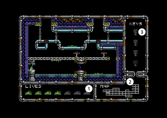 Ooze can reverse his own gravity and jump between surfaces below and above him - press the joystick Fire button to jump between them.