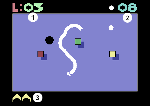 When the snake’s head hits an obstacle, the snake is destroyed and a life is lost, resetting the current level to the start. Bonus lives can be found in some levels - appearing as the same icon as the lives in the bottom left-hand side of the screen. Move the snake’s head over bonus lives to pick them up!