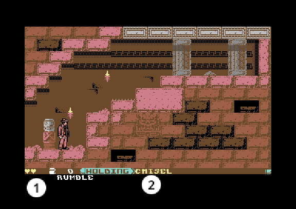 Some puzzles require Rocky Memphis to have obtained a specific item to complete - to find items, move the joystick down and hold the Fire button to search the ground below Rocky - if an item is found, it will be added to his inventory.